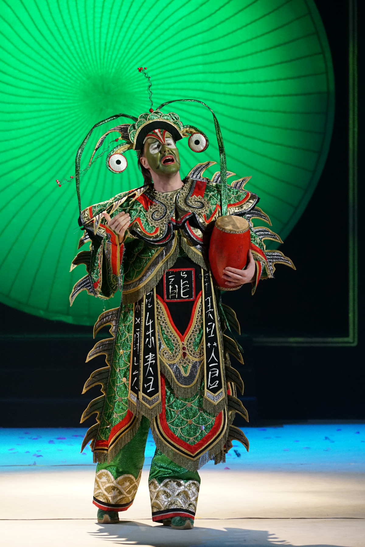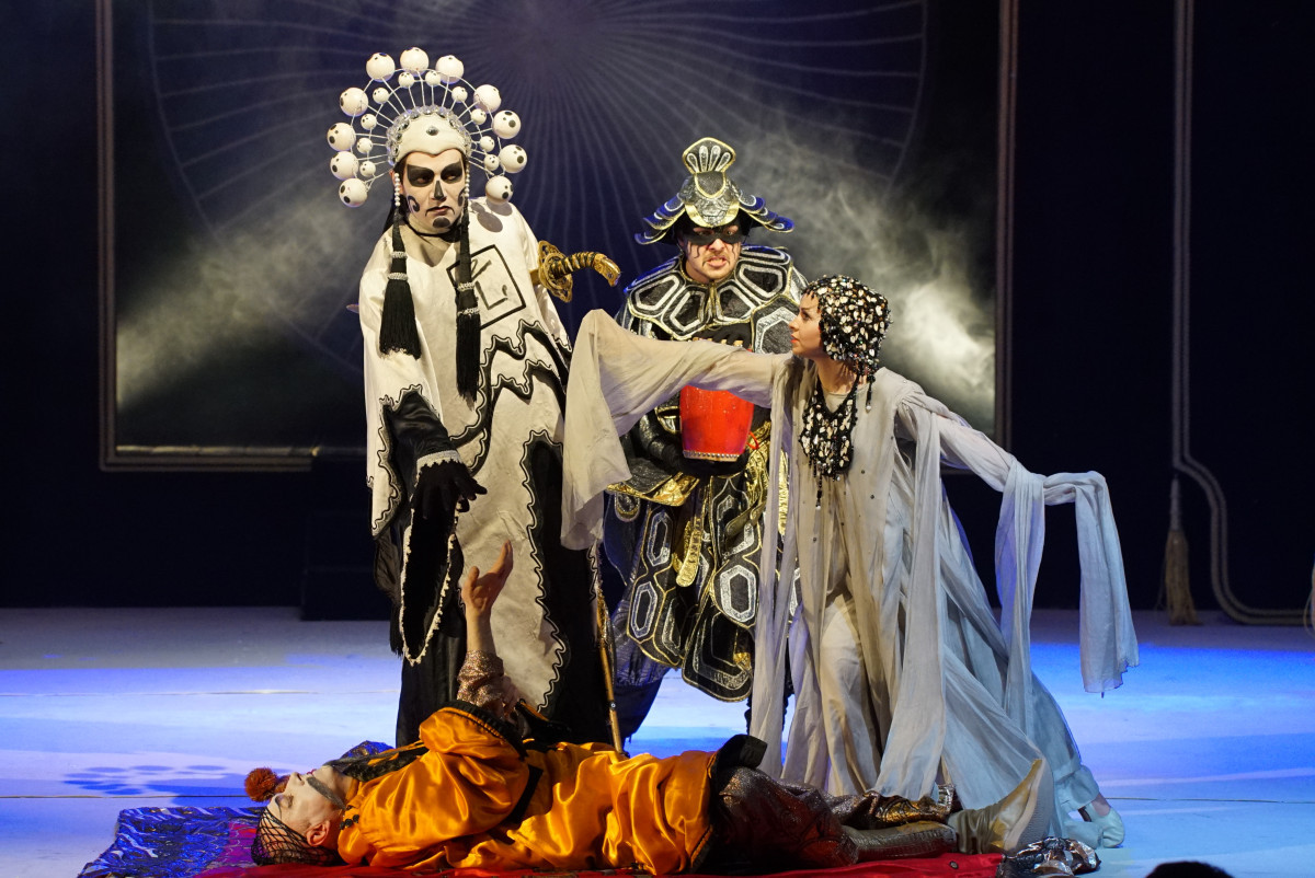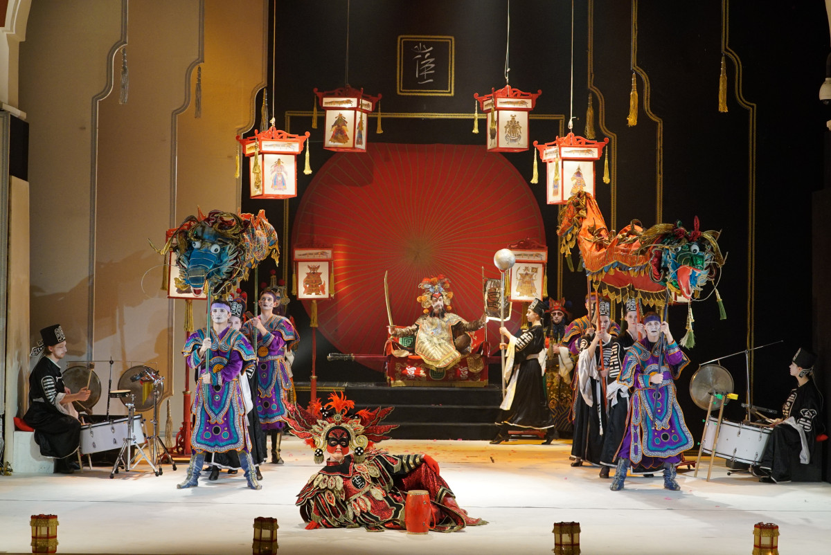 Спектакль завораживает магической атмосферой восточного ритуального действа, пряным, таинственным звучанием китайских ударных и духовых инструментов (оригинальная музыка в китайском стиле написана специально для этого спектакля). Экзотичные, изумительной красоты костюмы с затейливым шитьём, причудливыми аппликациями и золотыми узорами, гримы, превращающие лица в маски, эффектные, в восточном духе, декорации, фантастические головные уборы, оживающие китайские драконы, плывущие на шестах над зрительным залом — всё это пышное торжество роскошного сказочного востока поразит любого, даже самого искушенного зрителя.